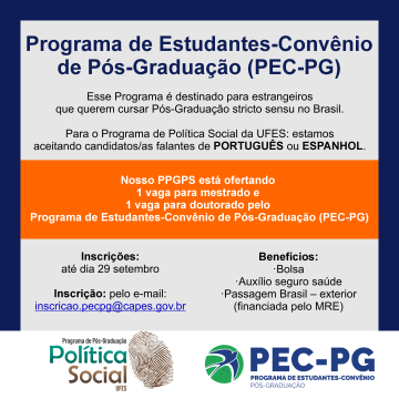 Nosso PPGPS está ofertando 1 vaga para mestrado e 1 vaga para doutorado pelo Programa de Estudantes-Convênio de Pós-Graduação (PEC-PG). Esse Programa é destinado para estrangeiros que querem cursar Pós-Graduação stricto sensu no Brasil. Para o Programa de Política Social da UFES: estamos aceitando candidatos/as falantes de PORTUGUÊS ou ESPANHOL.
